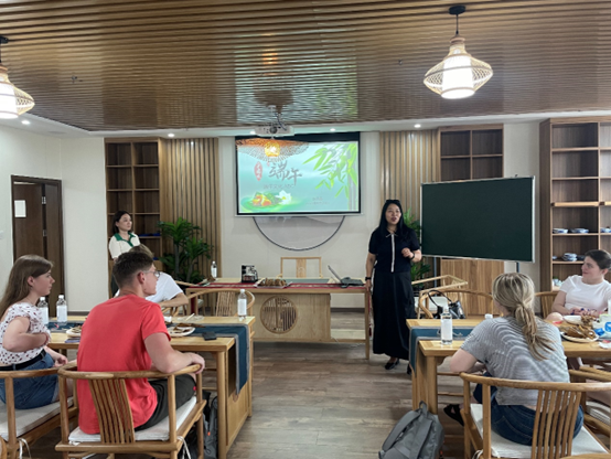活动伊始,陈运香教授向白俄罗斯师生们介绍了中国端午节的历史文化底蕴和传统习俗,如赛龙舟、吃粽子、拴五色丝线、饮雄黄酒等。通过陈老师的生动讲述与互动,学生们领略了端午节的历史渊源以及传统习俗文化,中白师生们在欢声笑语中品尝了粽子,现场洋溢着浓浓的节日气氛。