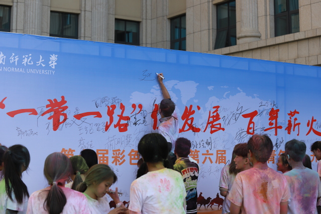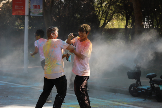 在礼花声中,彩色健康跑活动正式开始。阳光明媚的校园内,选手们身着白色短袖,在领跑员的带领下,依次前往蕴含不同意义和祝福的红、橙、黄、蓝、绿、紫的彩色站点。站点的工作人员将彩粉挥洒在奔跑者身上。同学们在奔跑中穿越彩色粉末,在欢笑中尽情绽放青春。活动结束后,全体成员在背景墙上签名并进行合照留念。边运动、边体验的彩色健康跑,有助于引导学生激活行为、绽放活力、努力出彩,实现身心共健康。