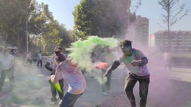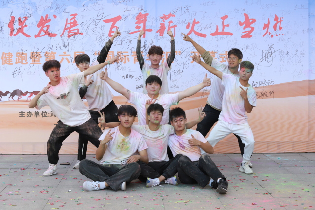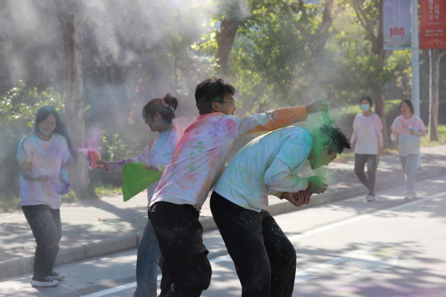 在礼花声中,彩色健康跑活动正式开始。阳光明媚的校园内,选手们身着白色短袖,在领跑员的带领下,依次前往蕴含不同意义和祝福的红、橙、黄、蓝、绿、紫的彩色站点。站点的工作人员将彩粉挥洒在奔跑者身上。同学们在奔跑中穿越彩色粉末,在欢笑中尽情绽放青春。活动结束后,全体成员在背景墙上签名并进行合照留念。边运动、边体验的彩色健康跑,有助于引导学生激活行为、绽放活力、努力出彩,实现身心共健康。