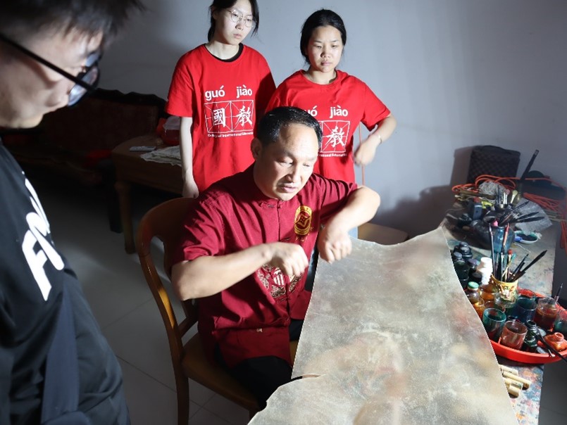 在罗山县龙镇村,实践队员围绕罗山县皮影戏的历史脉络及传承发展进行访谈,非遗传承人李世宏老师深情地说到:“皮影戏历史悠久,有关皮影的文字记载,最早见于2000年前的汉朝,生于光,安于三尺戏台,演唱高亢明亮、委婉动听,唱词诙谐幽默,朗朗上口。”随后,实践队员前往皮影收藏展厅参观学习,观看皮影戏表演,切实感受罗山皮影戏灯与影的艺术魅力。接下来几日,李世宏老师为队员们演示了罗山皮影戏演唱训练方法、演绎技巧、皮影制作工序等,耐心细致的向实践团队演绎皮影上色、上油等工艺。实践队员通过亲手操作,不仅感受到了制作皮影的不易,也更加敬佩那些默默坚守在传承一线的匠人们。