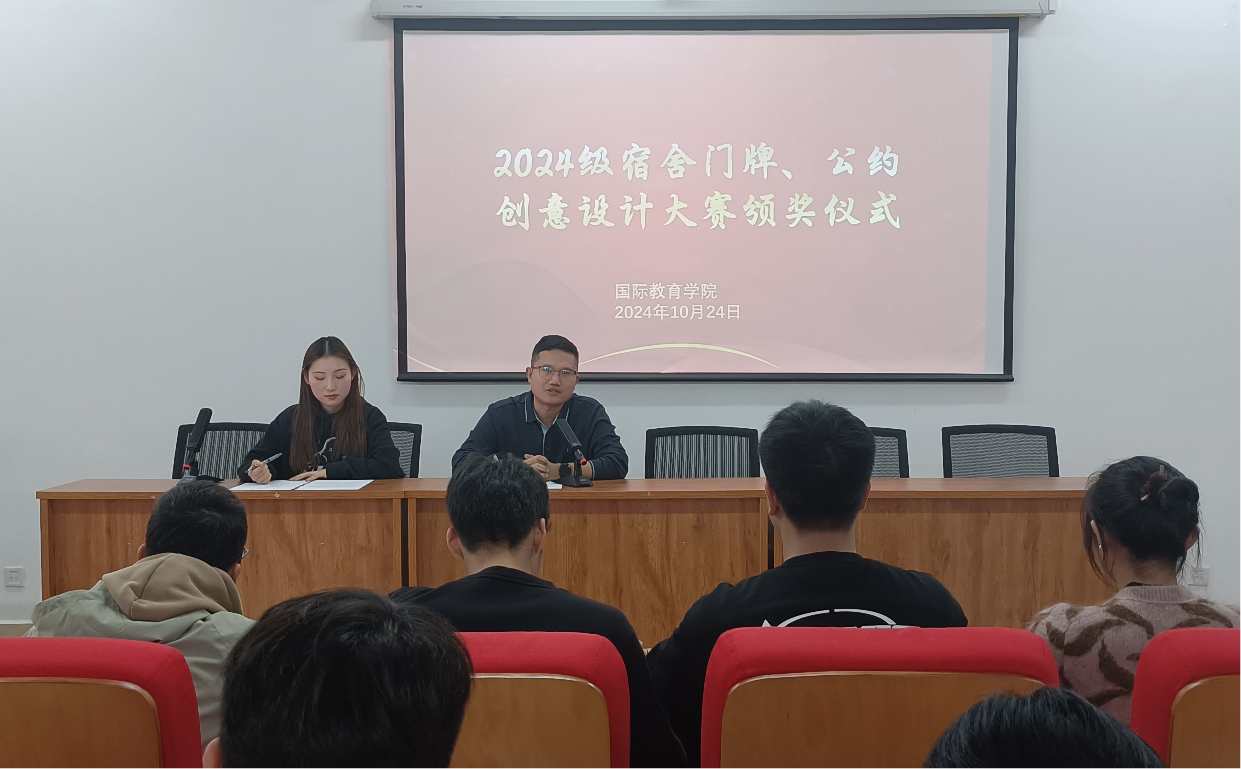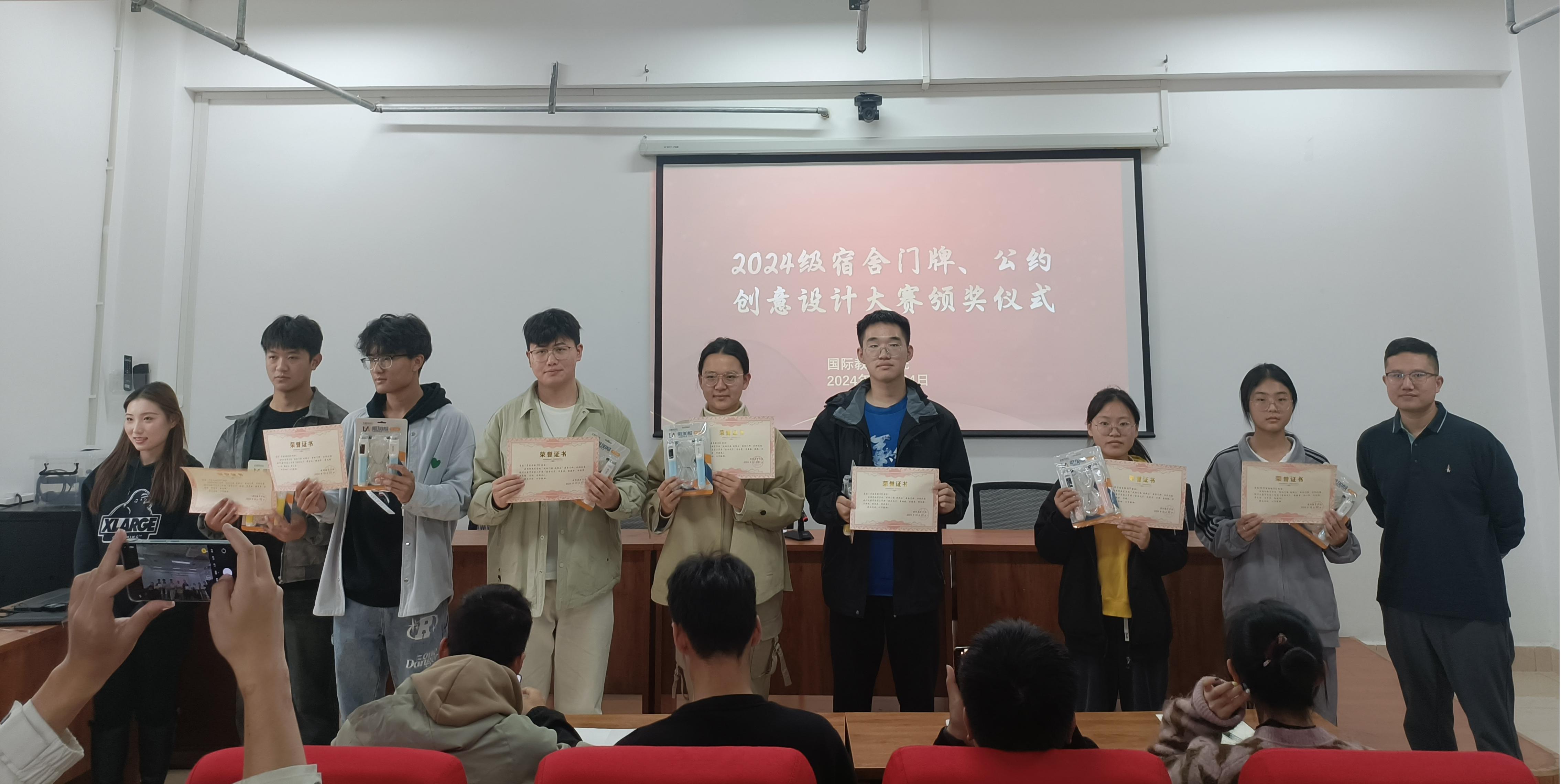 为弘扬“团结友爱,合作共赢”精神,增强宿舍凝聚力,加强宿舍文化建设,提升2024级新生对集体生活的认同感和责任感,10月15日至24日,国际教育学院举办了“我的门面我做主”宿舍门牌、公约创意设计评比大赛,颁奖仪式于10月24日在实训楼701报告厅举行,国际教育学院2024级辅导员、全体班委及宿舍长参加。