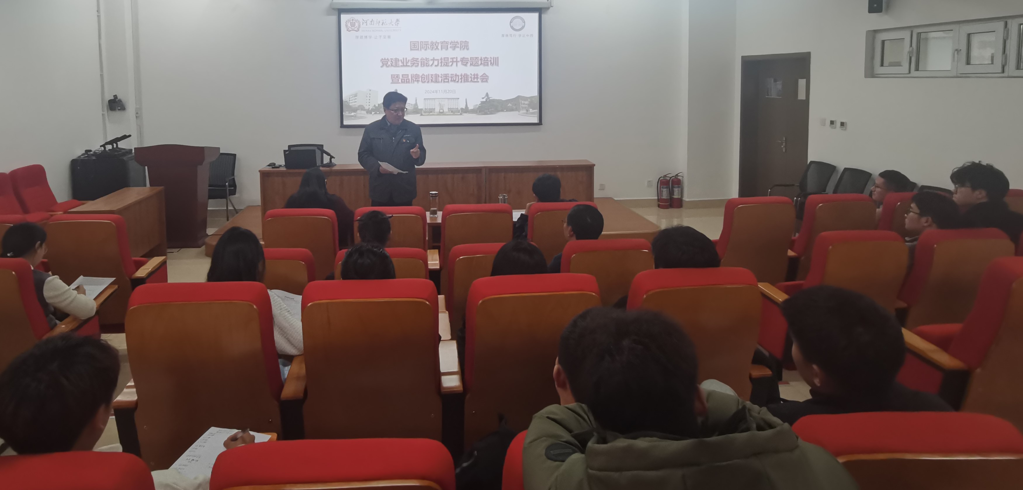 为加强基层组织标准化、规范化建设,积极推进党建品牌创建,11月20日下午,国际教育学院在求真楼701报告厅召开党建业务能力提升专题培训暨品牌创建工作推进会。学院党委委员、各党支部委员和部分党员代表参加会议。会议由学院党委副书记白丽主持。