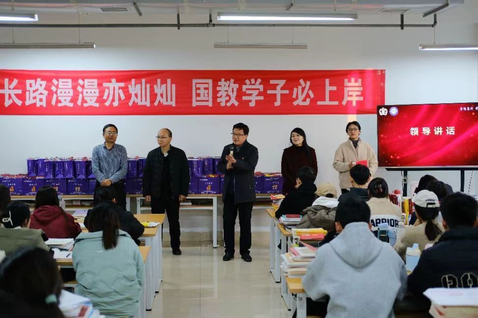 慰问活动在轻松愉快的团体小游戏中开始。学院领导老师在考研教室询问同学们的考研进度和生活状况,并对大家展现出的勤奋学习态度和积极备考精神表示赞赏。田小勇鼓励同学们:“奋斗的青春最美丽。”他强调,为强国建设、民族复兴目标不懈努力,是国教青年学子应有的模样,同学们追光而行,终会光芒万丈,提醒学子们不可掉以轻心,狭路相逢勇者胜、智者胜,坚韧不拔、坚持到底、准备周全者胜。董海对同学们表达了深厚的期望,他强调每一位学子都是学院的骄傲,他们的每一步成长都承载着学院的希望和重托。白丽对同学们在备考过程中的努力和坚持给予了充分肯定,她指出,人生的路每一步都算数,每一天的努力都在为未来积蓄力量,并终将化作满天星照亮前行的路。刘海涛提醒大家,面对挑战时不要过度焦虑,以平和的心态迎接每一次考验。2021级考研学生代表陈宇博对老师们的关怀和鼓励表示衷心感谢,并承诺考研学子将全力以赴,勇往直前。2022级在校生学生代表许亦飞向学长学姐们送上了诚挚的祝福。随后,领导老师为考研学子发放精心准备的“暖心礼包”。