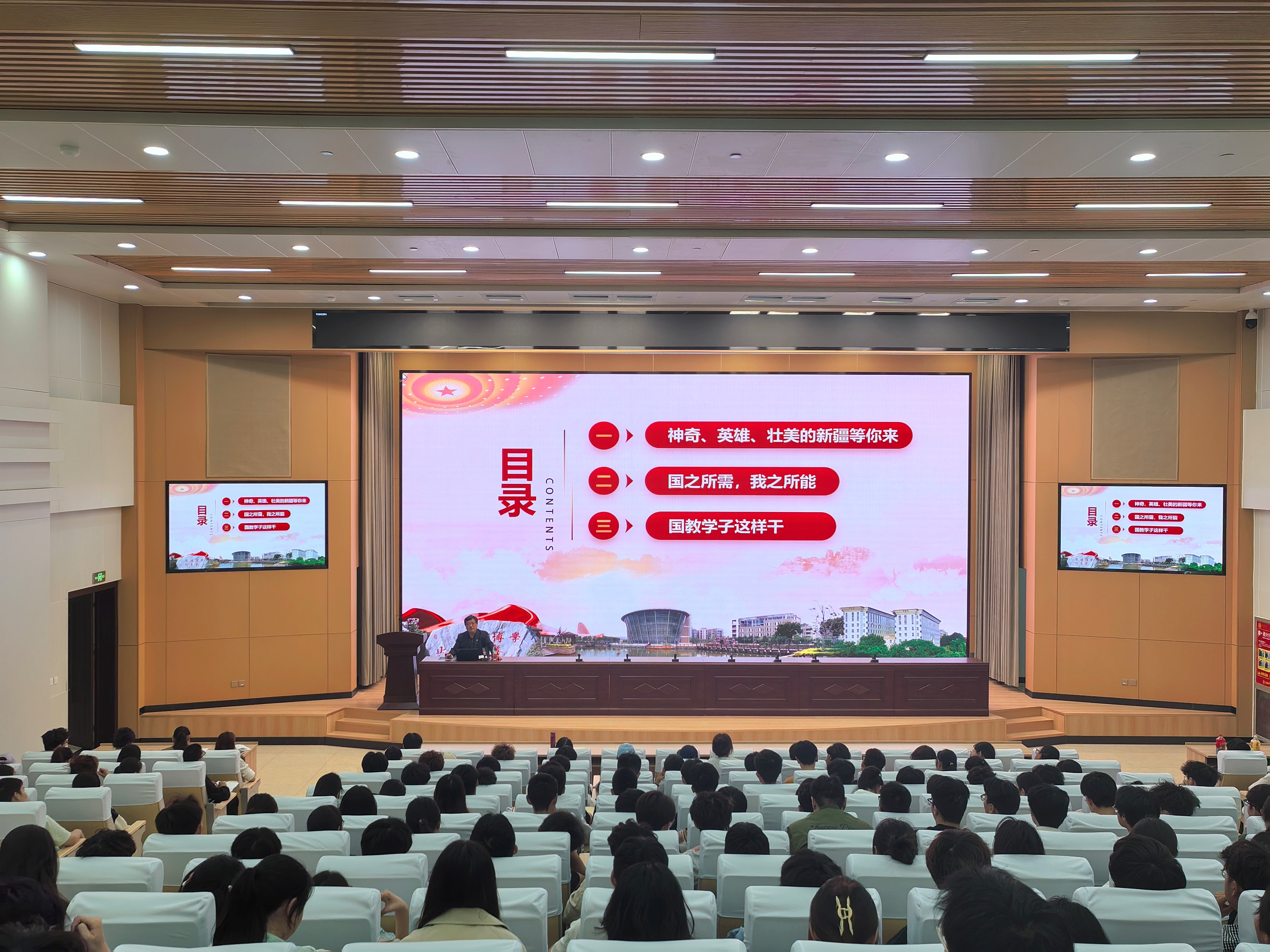 田小勇以《青春是用来奋斗的!》为题,从新疆的迷人自然人文景观、矿产“风光”资源富集、现代化产业人才需求强劲等方面切入,讲解了神奇、英雄、壮美的西部地区是青春的舞台,更是奋斗的沃土。在国家富强、民族复兴和学校发展层面,田小勇阐述了2025全国两会、《教育强国建设规划纲要(2024—2035年)》和我校第七次党代会精神,强调新时代西部大开发形成新格局,选择西部就是选择与时代同频共振,激励国教学子向下扎根、向上生长、向内激励、向外扩展,厚德笃行、奋楫者先、勇进者胜、一往无前,将个人奋斗的“小目标”融入教育强国建设和实现民族复兴的“大蓝图”,到祖国需要的地方贡献青春力量,奋力成长为有理想、能吃苦、本领强、视野宽、敢斗争、善胜利的新时代好青年。通过腾讯会议,张世豪从西向就业对大学生的优惠政策和在新疆执教的感悟,生动地讲述了支教生活的奋斗故事,号召同学们以“国之所需、我之所向”的担当,在西部广袤天地间书写别样精彩的人生答卷。