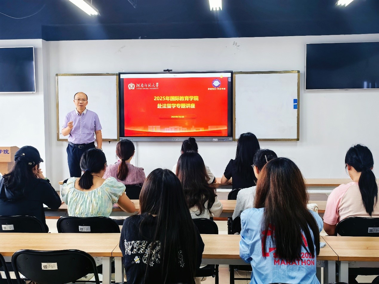 为深化国际交流合作,助力法语专业学子拓宽学术视野、规划多元发展路径,2025年7月3日下午,国际教育学院院长董海在实训楼714教室为法语专业学生举办“赴法深造专题指导讲座”。本次讲座围绕国际合作项目解读、培养路径规划及学习实践建议展开,为有意向赴法留学的学子搭建了系统性信息平台,注入了清晰的行动指引。