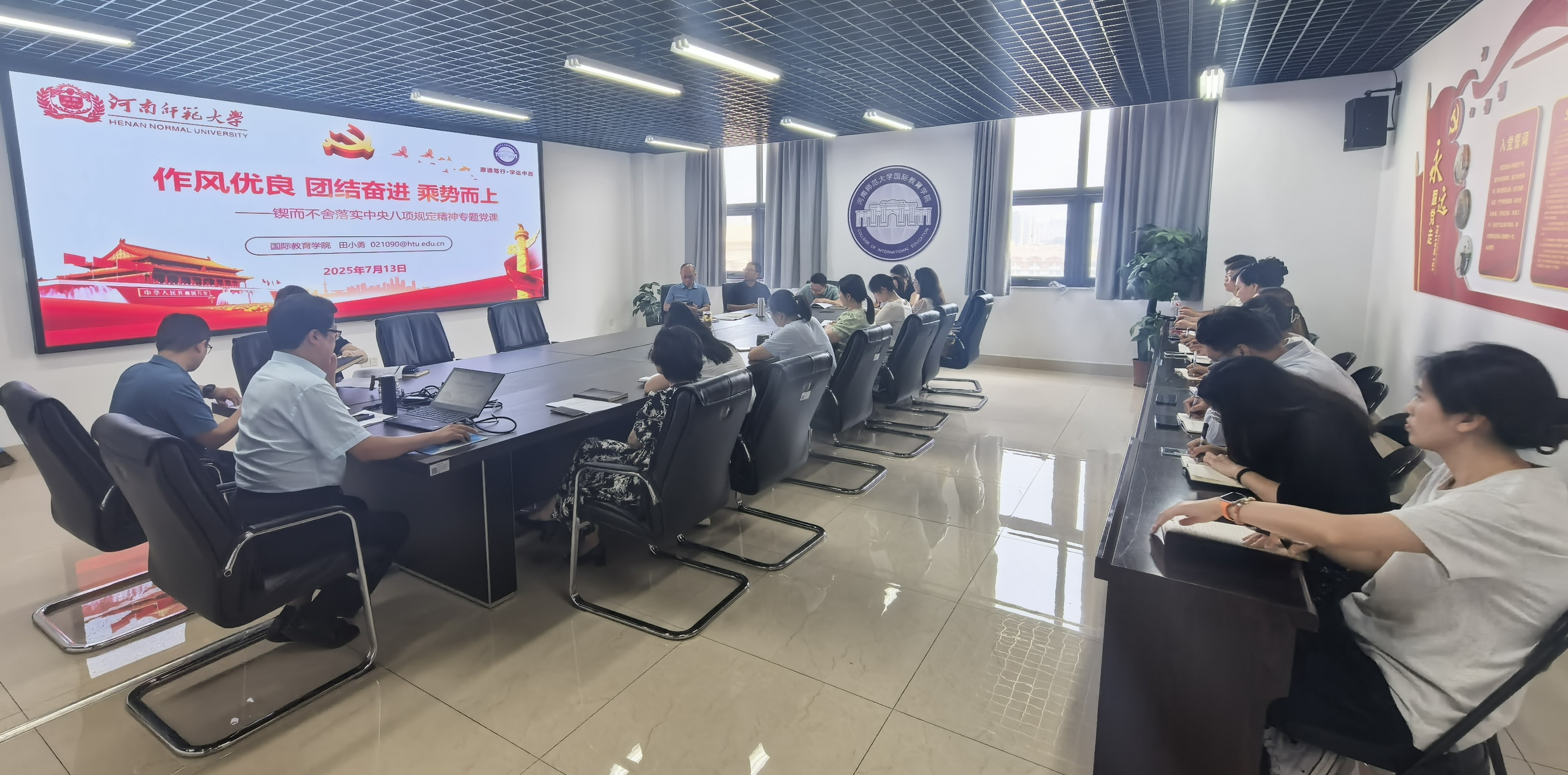 为确保深入贯彻中央八项规定精神学习教育善始善终、善作善成,7月13日下午,国际教育学院开展以“作风优良 团结奋进 乘势而上”为主题的锲而不舍落实中央八项规定精神专题党课。党课由学院党委书记田小勇主讲,学院全体教师参加学习。