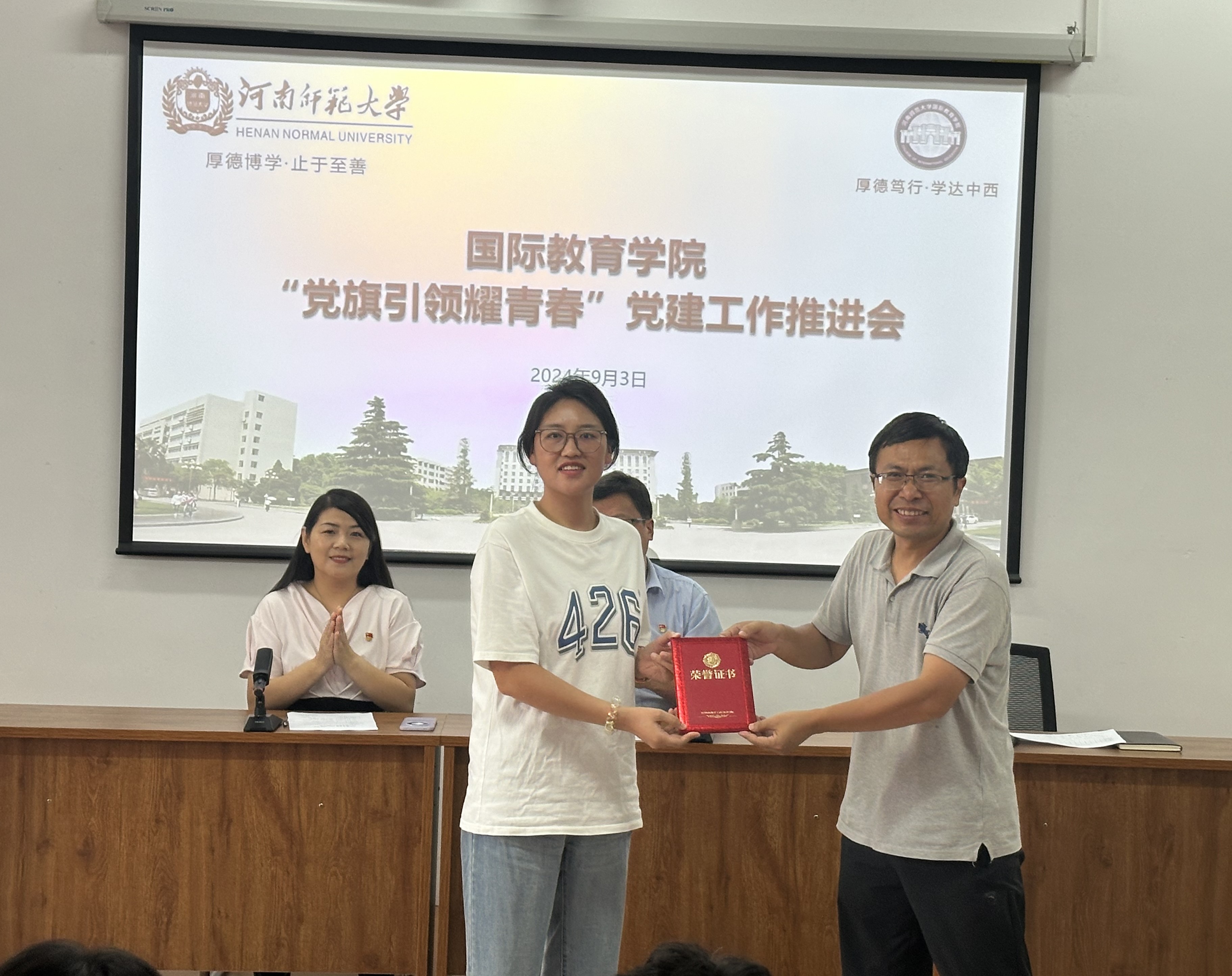 为进一步学习贯彻党的二十届三中全会精神,深化“基层党组织建设年”活动成效,增强支部政治功能和组织功能,推进党纪学习教育常态化长效化,9月3日下午,国际教育学院在学院701报告厅召开“党旗引领耀青春”党建工作推进会。学院各党支部委员、全体教师党员参加会议。会议由学院党委书记田小勇主持。
