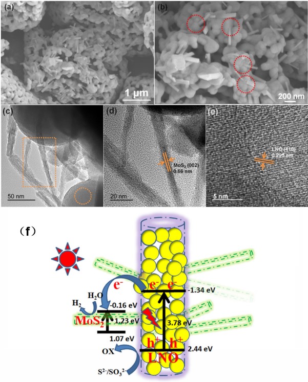 图1. 1D-MoS2纳米棒/LiNb3O8超结构的 (a, b) SEM, (c) TEM, (d, e) HRTEM图像和(f)结构和载流子分离示意图。