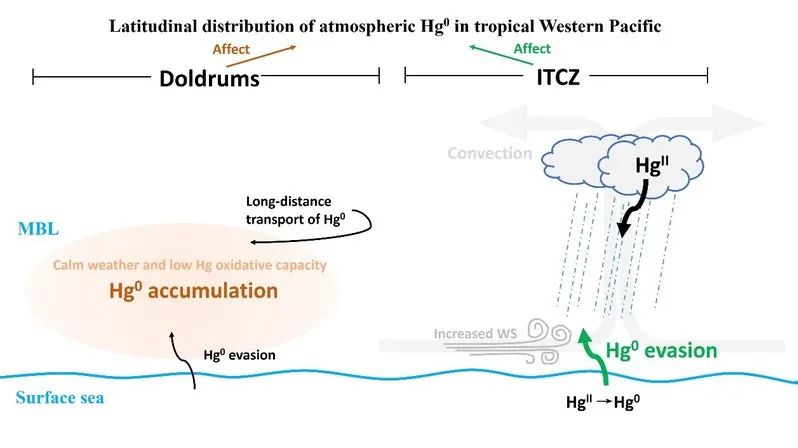 图 热带西太平洋赤道无风带(doldrums)及赤道辐合带(ITCZ)对大气汞纬度分布的影响机制示意图