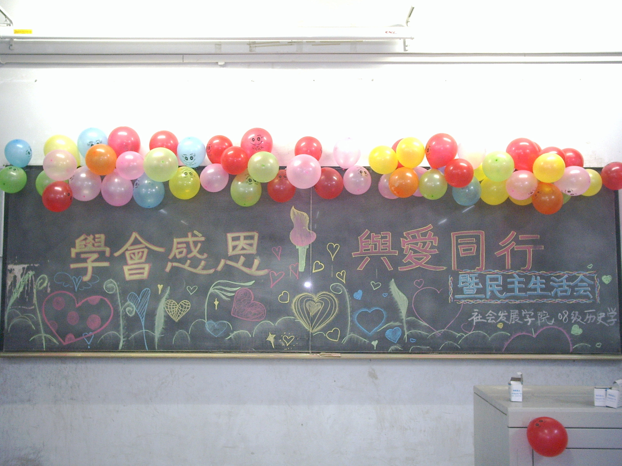 | 社会发展学院第三届“感恩月”活动正式开幕 为进一步强化感恩教育,营造和谐校园文化, 活动始终伴随着经典的感恩歌曲,同学们纷纷在“学会感恩 共创和谐 青春与责任同行”的横幅上签下自己的姓名以及对家人、朋友、恩师、学校、社会的感激与祝福。与此同时,“我想对您说”主题活动也在进行,同学们用摄影机真实记录了自己的点点滴滴的感动话语,吸引了过往同学的踊跃参与。这其中,有对父母健康祝愿的温情,有对同学关心的感动,有对学校发展的期望,有对母校培育的感激……2007级的韩永明同学对着镜头说:“师大,感谢您的包容、您的豁达,您是我思想的引航者,理想的见证者,十年后的重逢我将长大,也将反哺……”朴实的话语道出了最深的祝福、最切的情谊,也表达了同学们对学校发展的充分肯定和美好祝愿。 2007年,社会发展学院将十二月份定为“感恩月”,至今已走过了三个年头。据悉,本届“感恩月”系列活动还包括感恩主题班会、感恩电影巡展、“一封家书”、“短信寄语”、“心有千千结”座谈会等。 (社会发展学院 邢 威 孙良娟) 社会发展学院2008级历史学班举办以“学会感恩,与爱同行”为主题的民主生活会