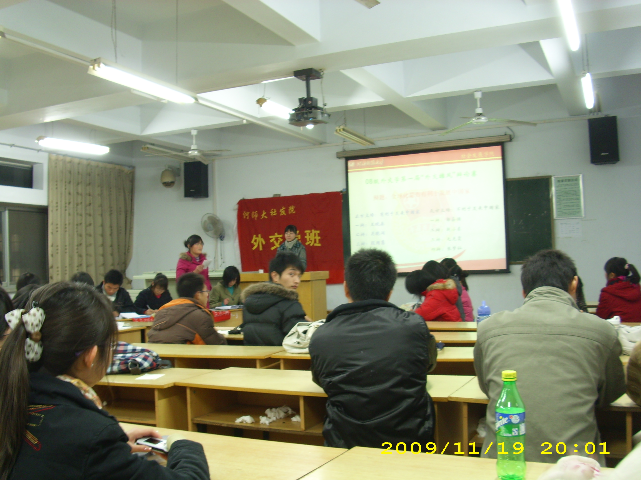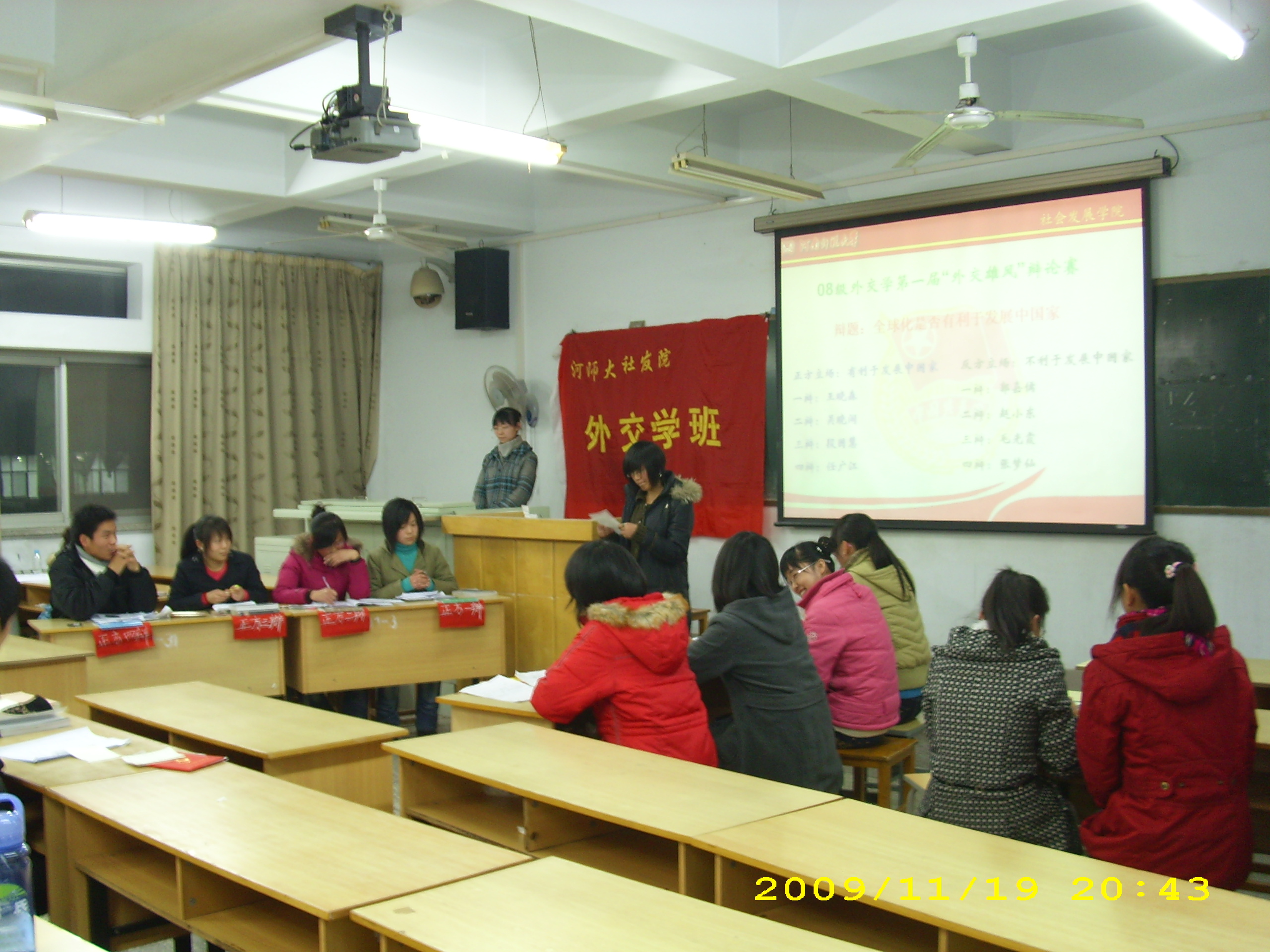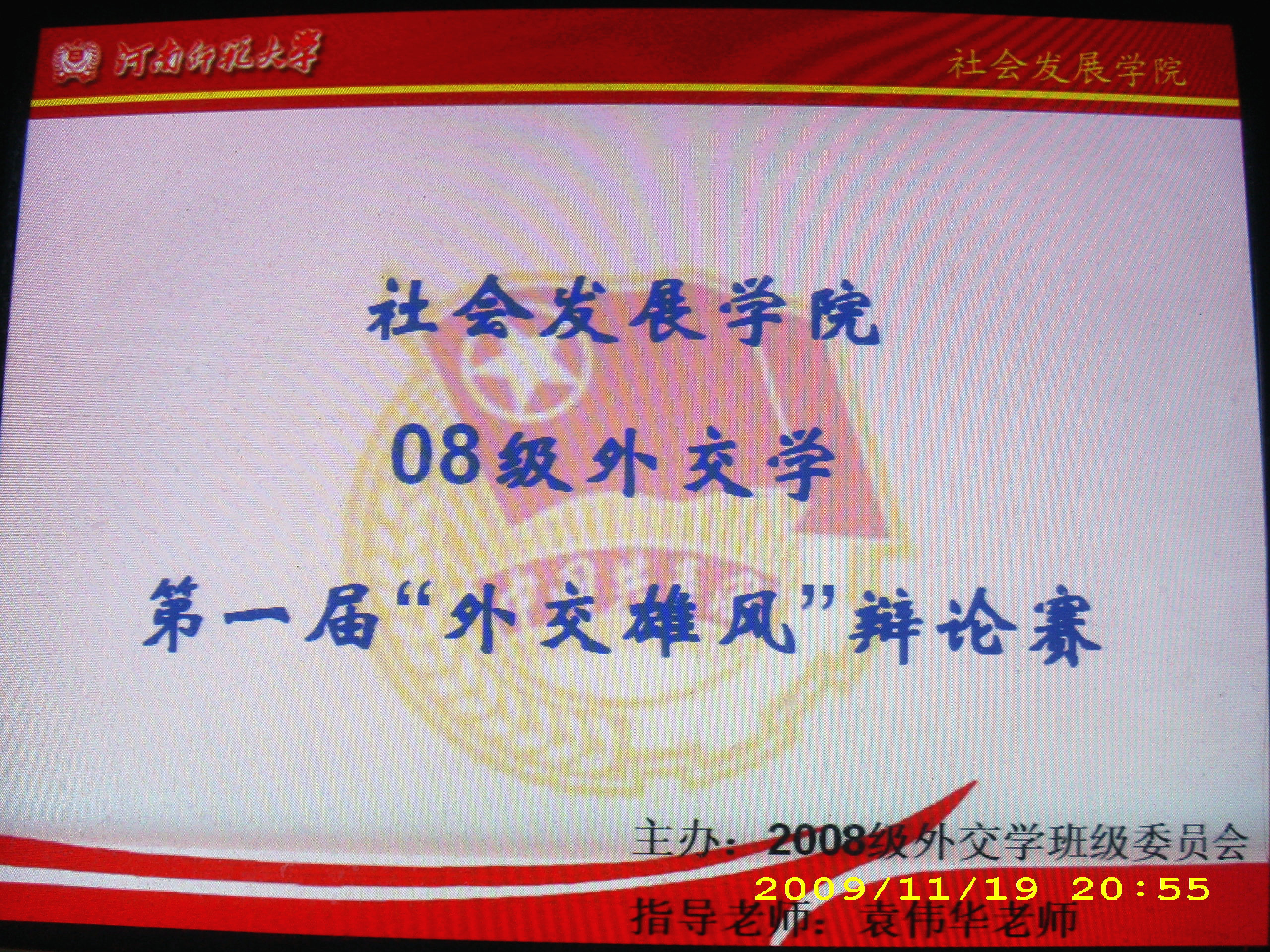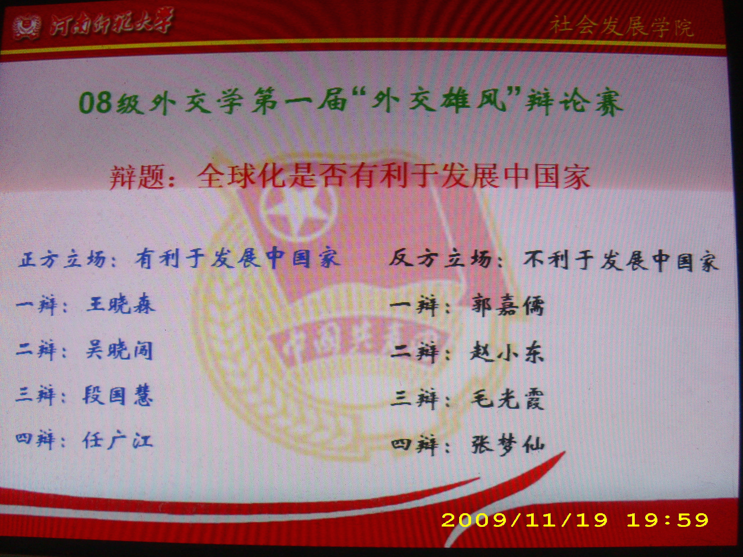 展示外交风采,绽放智慧光芒。 本次辩论赛的辩题为“全球化是否有利于发展中国家”。正反两方八位辩手就此辩题展开激烈的辩论。正方认为在当今世界不断发展的形势之下,全球化是任何国家都不能避免的,尤其对于发展中国家具有有利的影响。而反方则认为,全球化固然是全球发展的大趋势,但其更大程度上是为发达国家服务的,并且会在某些方面对发展中国家带来不利的影响。双方辩手各抒己见,据理力争,展开了针锋相对的唇枪舌剑,激烈的场面使现场不断升温。 辩论结束后,班长杜飞阳及其他几位评委对此次辩论赛作了点评。随后袁伟华老师也对此次辩论赛作了精彩的点评,他充分肯定了同学们的表现,并指出了一些不足。他希望同学们在今后的辩论中不断改进,充分展示自己的风采。 此次“外交雄风”辩论赛给同学们提供了一个展示风采的舞台,对外交学专业同学的综合素质具有很大的提升作用。据悉,此项活动将作为外交学专业的传统延续下去。 (社会发展学院 陈晓航)