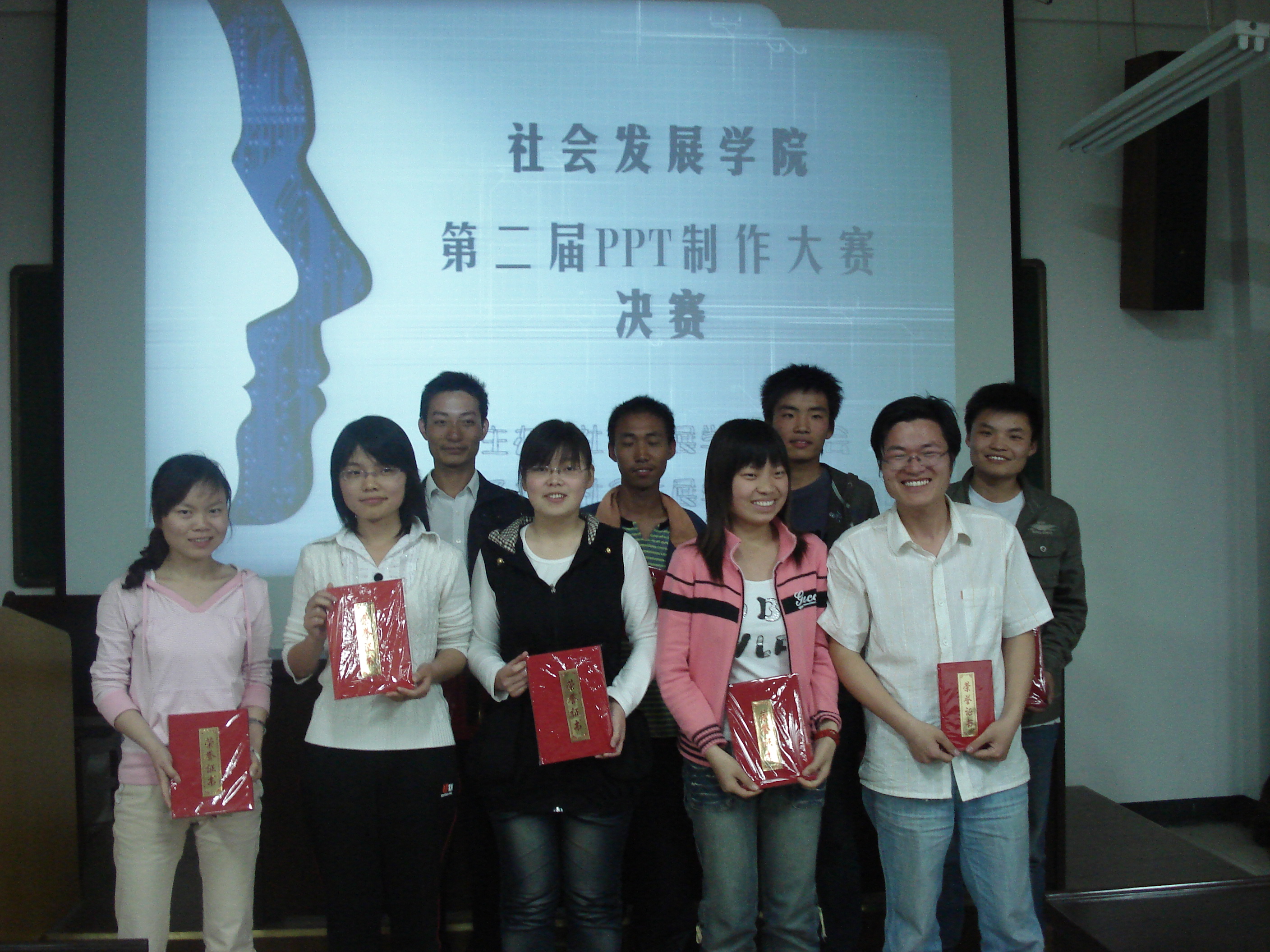获奖选手(部分)风采 4月26日晚,社会发展学院学生会网络信息部在我院东区办公楼406学术报告厅进行了社会发展学院第二届ppt制作大赛决赛暨展演活动,近百名学生参与了这次展演。 此次展演共展示了包括06,07,08三个年级的15部优秀作品。本次评比创新了评奖方式:首先在决赛前邀请化学与环境科学学院、政治与管理科学学院、经济与管理学院、美术学院、教育科学学院等五个院的网络信息部部长精挑细选、综合评定,然后由在场的观众当场审核,不符合质量标准的作品将被刷下;以同等年级作品进行评选,尤其对06级要求更为严格。最终产生了15份精彩作品进行展演,它们内容新颖、形式精美、主题广泛,涉及历史、旅游、班级、人生、奥运等多个方面,其精美的制作和近乎完美的放映吸引了在座所有观众的眼球。而其中的一等奖作品《爱――小虎队(MTV)》以其唯美浪漫的动人画面以及歌词与歌曲的完美配合震撼了在座所有观众;另一一等奖作品《开封》则凭借详尽充实的文字介绍与精美诱人的实物图片,使在场观众赞叹连连。本次展演精彩不断、高潮迭起,持续了近两个小时,最终在同学们的喝彩声中落幕。最终经过在做观众审核,评出一等奖两名,二等奖五名,三等奖九名,优秀奖若干。 社会发展学院第二届PPT制作大赛活动共收到作品77份,创造了一个奇迹,大家在制作的过程中体验到了喜悦,学习到了坚持。本次活动极大地激发了大家学习计算机的兴趣,扩充了同学们的视野,将对推动我院的计算机技能的普及起到重要的作用。 (社会发展学院 蒋晋光 李晓宇 张梦仙 李科) |