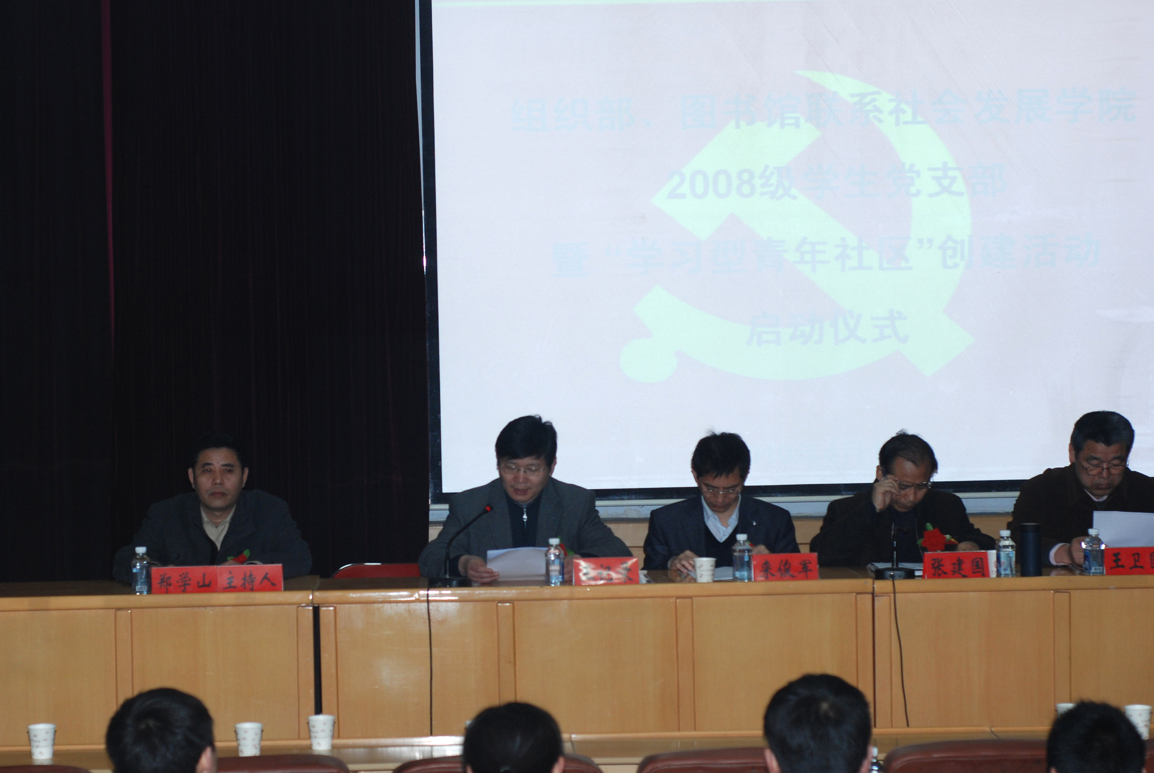 在雄壮的国歌声中,启动仪式正式拉开帷幕。组织部部长张建国在会上作了《学习与人生》的主题讲话。他从学习的内涵界定、学习的价值意义和学习的方法途径三个方面,指出学习是延续文明的重要桥梁,在愉悦身心的同时,不仅能够改变观念扩展视野,而且能够完善自身的素质,提高解决问题的能力;要善于不断在追问中学、在反思中学、在实践中学、在竞争中学,同时在学习中要不断拓宽学习平台。最后,他希望同学们能够充分借助“学习型青年社区”这个平台,不断学习,不断进步,充实自我,完善自我。 图书馆党总支王卫国书记也结合此次“学习型青年社区”创建活动,围绕创新人才的培养工作,希望同学们在实践活动中注重培养科学精神、合作精神和奉献精神,努力提高思想道德水平、政治理论水平和专业技术水平,不断增强思考能力、实践能力和创新能力。 会上,李清富书记宣布了《社会发展学院党总支关于创建2008级“学习型青年社区”的决定》,并向2008级党支部提出三点建议,希望2008级以此次活动为契机,不断解放思想更新观念,深入加强与机关的交流与合作,切实履行模范带头作用;王记录院长代表学院宣读了《组织部、图书馆联系社会发展学院2008级学生党支部暨社会发展学院2008级“学习型青年社区”创建活动实施方案》。 在欢快喜庆的气氛中,组织部、图书馆和学院领导共同为“学习型青年社区”揭牌。组织部、图书馆还专门赠送了各类书籍、期刊杂志、体育器材和优盘等。 此次“学习型青年社区”创建活动,是我校机关党支部联系学生班级活动的一次有益尝试,为青年学生健康成长成才提供了一个良好平台,将进一步发挥机关党支部在服务大学生思想政治教育工作中的积极作用。 (社会发展学院 张峰 邢威/文 组织部 高飞/图) |