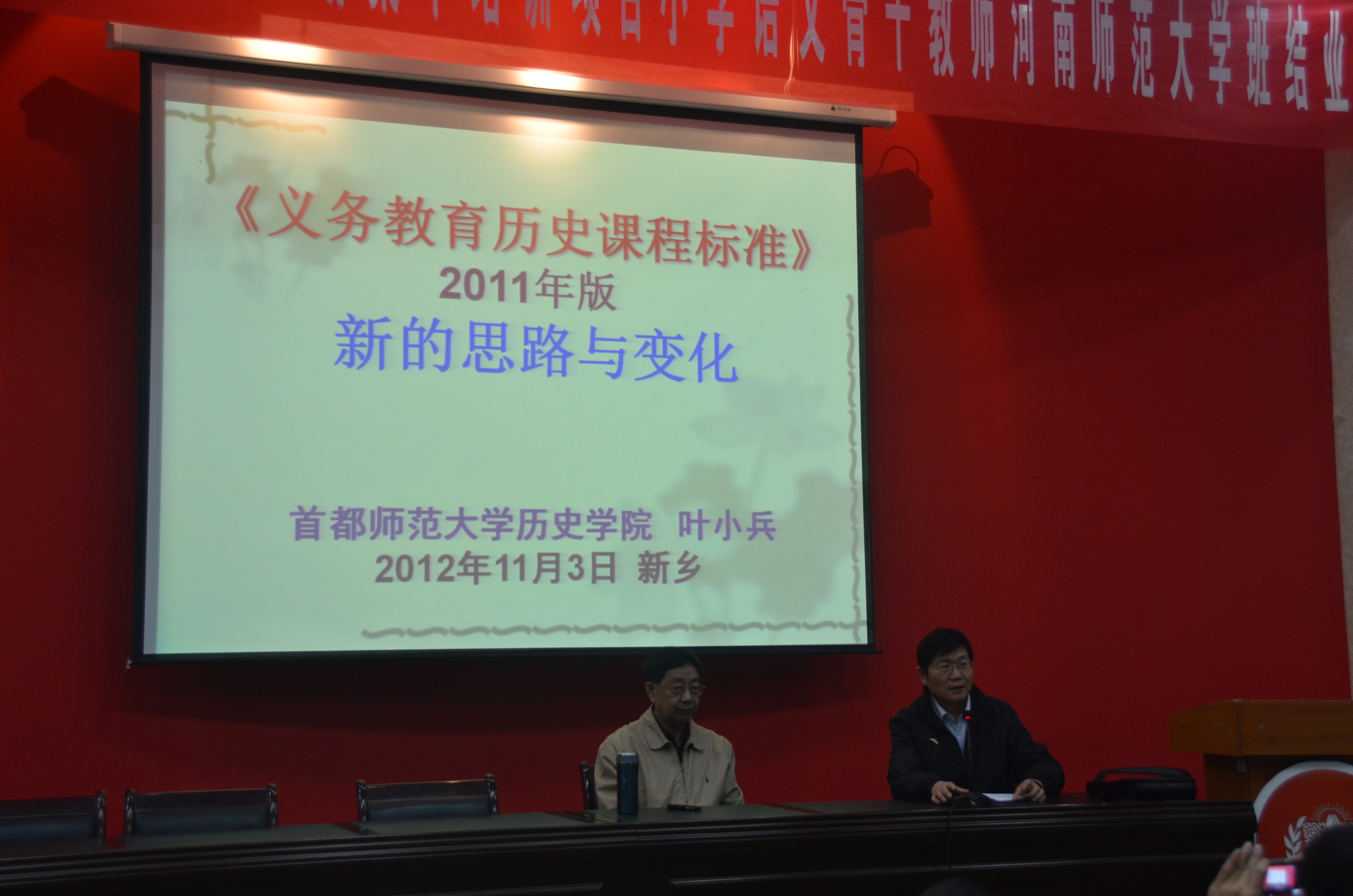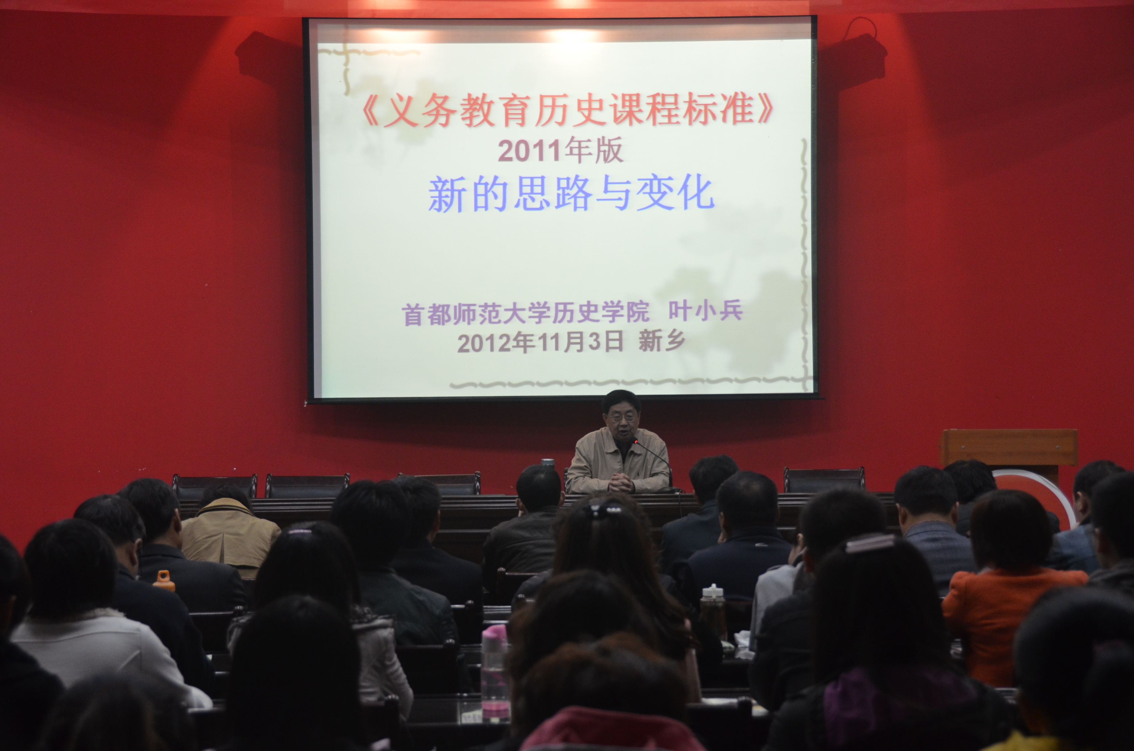 11月3号上午,中国教育学会历史教学专业委员会副理事长,北京市历史教学研究会理事长,北京市地方教材审查委员会历史科审定委员,首都师范大学教授叶小兵应邀来我校讲学,叶教授在文学院报告厅作了题为“《义务教育历史课标(2011年版)》新的思路与变化”的学术报告。报告会由我院院长王记录教授主持。我院副院长原瑞琴教授,河南省教育学会历史教学专业委员会副理事长牛琳老师,我院部分专业学位研究生、“硕士计划”研究生及本科生,“国培计划”初中历史学科培训班全体学员聆听了此次报告。
