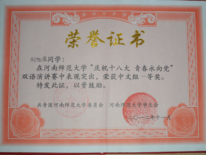 刘旭滢在伟德官网下载苹果版“庆祝十八大 青春永向党”双语演讲赛中荣获中文组一等奖