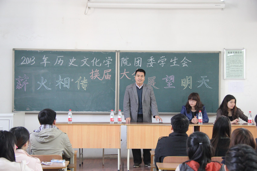 薪火相传,展望明天。39日上午9:00,历史文化学院在教学楼B301室举办了历史文化学院2013届团委学生会换届大会。院党总支副书记康海军、团委书记张利兵、各级辅导员及辅导员助理出席了此次大会。2012届、2013届团委学生会全体学生干部参与了本次换届大会。大会由团委书记张利兵主持。