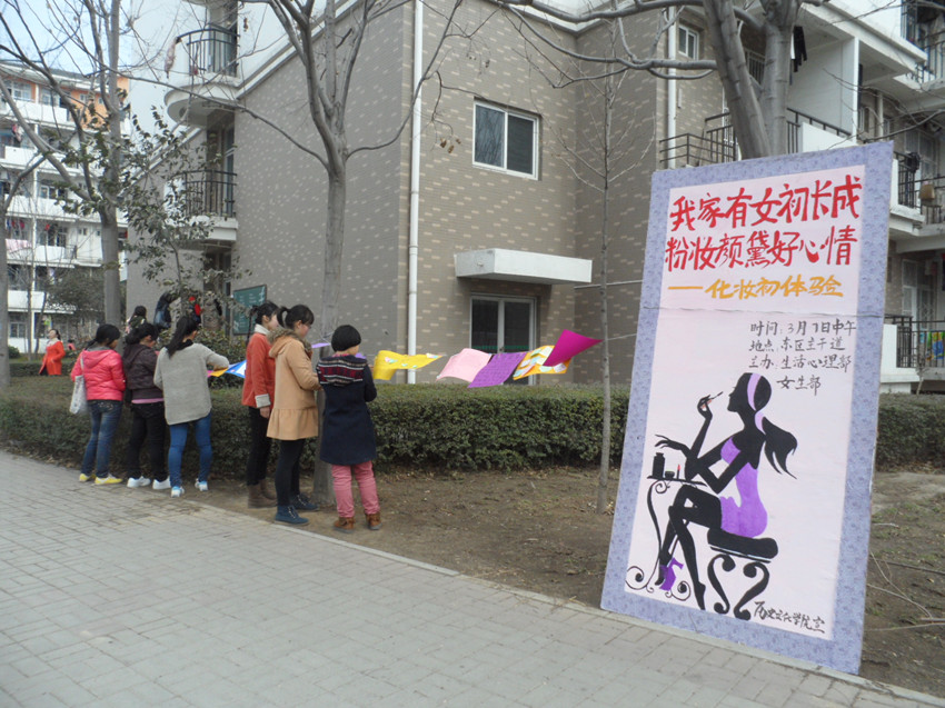 发肤受父母,粉黛妆更俏。37日中午12:30,由历史文化学院主办,学生会生活心理部与女生部共同承办的以“家有吾女初长成粉妆颜黛好心情”为主题的化妆初体验活动在东区主干道举办。