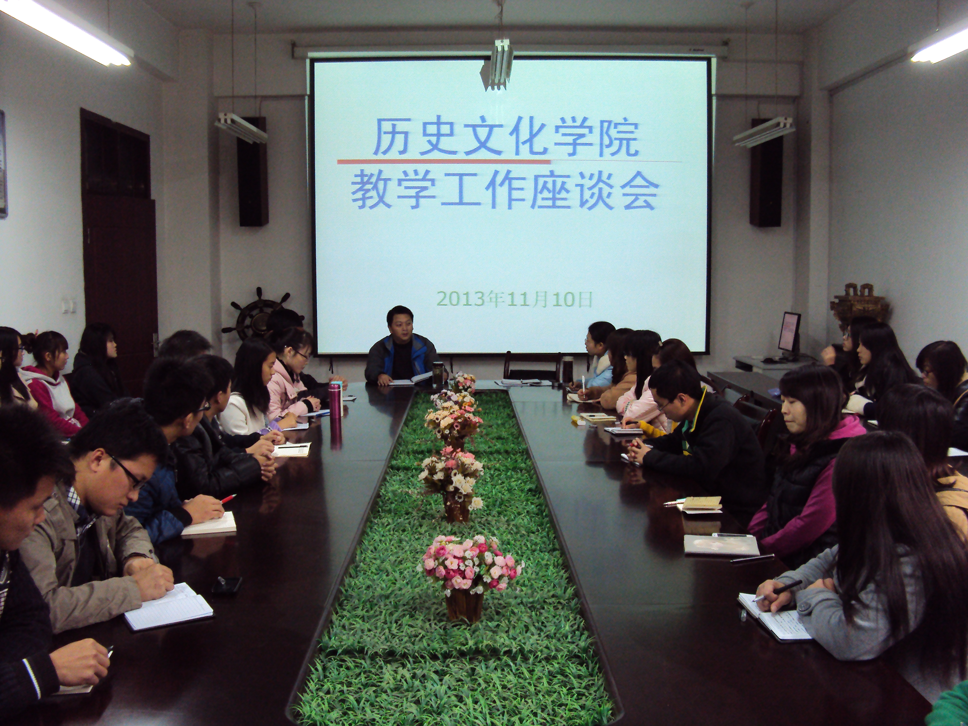 20131110日下午,历史文化学院在学院小会议室举行教学工作学生座谈会,会议由鞠明库副院长主持,来自全院各年级各专业的近40名学生参加了座谈会。