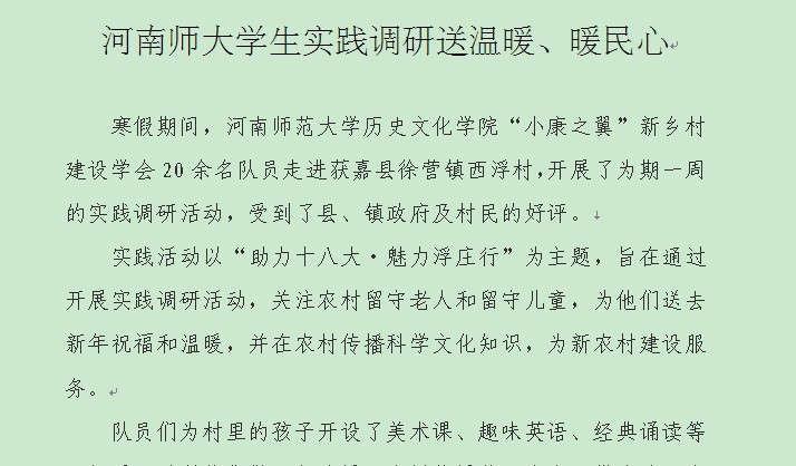 今年寒假期间,伟德官网下载苹果版历史文化学院“小康之翼”新乡村建设学会20余名队员走进获嘉县徐营镇西浮村,开展了为期一周的社会实践活动,得到了县、镇政府及村民的好评。