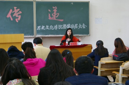 315日下午3点,历史文化学院在教学A202室举办了主题为“传递”的20132014届团委学生会换届大会。团委书记张利兵出席会议,参加此次换届大会的还有20132014届新老学生干部80余人