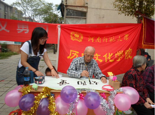 为迎接九九重阳节的到来,历史文化学院社会实践部在伟德官网下载苹果版家属院开展了重阳敬老活动,希望在凉凉的秋意中为老人们送去温暖。活动前志愿者积极布置活动场地,热心地为每一位路过的老人发送老年人健康知识小卡片,并且耐心为他们解读。一位退休的老教师吹奏笛子与志愿者共同完成歌曲《荷塘夜色》,获得了热烈的掌声。同时,她对同学们的做法给予了高度的肯定。吕老先生今年95岁高龄,为了感谢志愿者,他在现场题字鼓励,对志愿者的工作给予了很高的评价。活动现场,志愿者认真耐心地和老人们交谈,给老人们唱歌,通过表演各种才艺表达出对老人的敬爱和感恩之情,敬老活动在融洽的气氛中顺利完成。