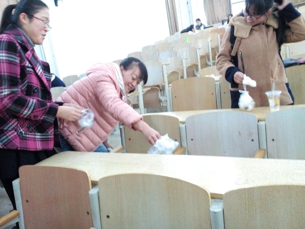 在2014级辅导员王雪娇的带领下,由各个年级学生党员及入党积极分子组成的四组志愿者主要针对学校东校区的教室和宿舍周边卫生进行清理和打扫。一、二组的志愿者负责清扫A、B教学楼各个教室的地面和抽屉;三、四组的志愿者负责捡拾寝室楼周围的草丛、水泥地面的垃圾,并整理随意摆放的自行车。在活动中,我院师生表现出不怕脏、不怕累的良好精神风貌和阳光向上、乐于奉献的优秀品质,取得了较好的活动效果。同时,我院努力把卫生清扫活动做到长期化、实效化、全面化,持续将美化校园环境工作落到实处。