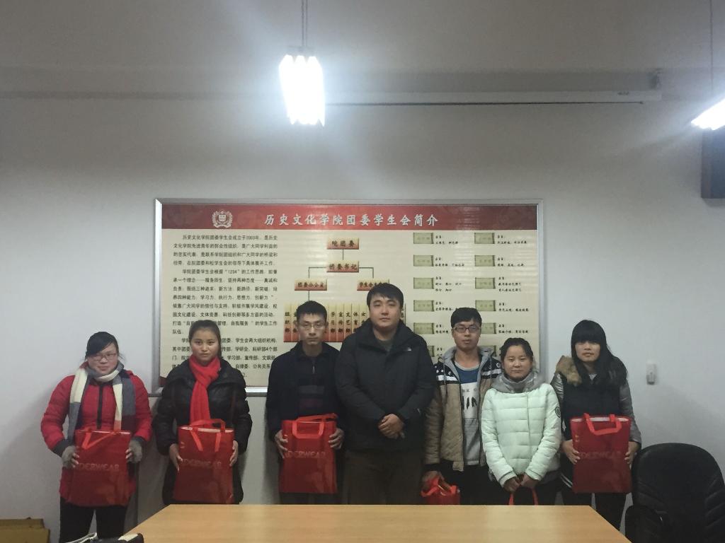 温馨师大,温馨历院。11月30日晚19:30,历史文化学院在学院办公楼105室举行2015级困难新生冬季实物补助发放仪式。历史文化学院团委负责老师原方出席本次活动,2015级辅导员马田园主持此次仪式。2015级受助同学参加仪式。
