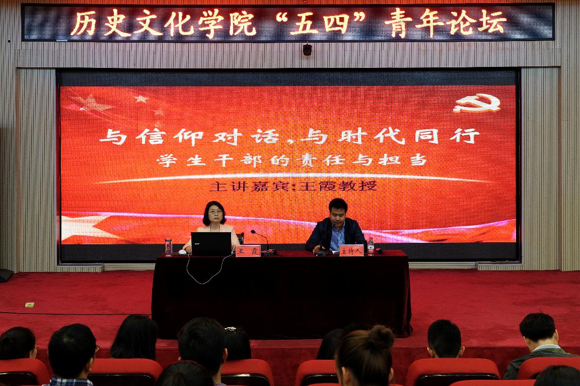 与信仰对话,与时代同行。5月3日晚,历史文化学院在思政平台举办“五四”青年论坛——“学生干部的责任与担当”主题讲座。本次讲座由我院党委书记王霞主讲。我院团委负责老师原方、2014级辅导员王元元及2015级辅导员吉喆、马田园参加本次活动。此外,我院2016届团委学生会骨干、2015级学生代表参与本次讲座。校团委、各兄弟学院老师代表及学生骨干代表受邀参与本次活动。本次讲座由我院党委副书记康海军主持。