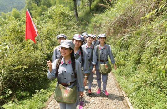 踏上这段扑面而来充满青砖、红土的路途,身着红军服的队员们步行在紧邻悬崖的小路,心中已是忐忑万分。虽然所走的已经是后期修成的体验道路,但队员们每一次的抬腿向上都是一次又一次的考验,队员们衣服被打湿了,汗流不止;力气也用尽了,只能凭着本能往前走。在互相帮助下,队员们最终艰难到达目的地。