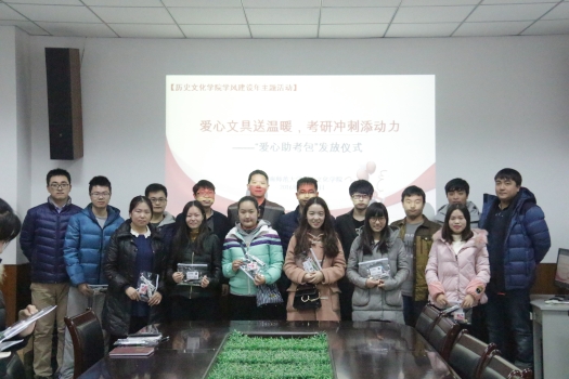 2016年11月30日上午9:00,历史文化学院“爱心助考包”发放仪式在二楼会议室举办。学院党委副书记张壬、团委书记原方、13级辅导员张永富、13级兼职辅导员王若茜、各专业班主任和13级学术型学生代表50余人参加了仪式。