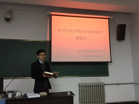 辅导员马田园主持了2015级本科生支部的学习交流,与会人员观看了纪录片《初心》及《梁家河的故事》,共同回顾了习近平总书记在梁家河的七年知青岁月。王朝阳、闫本强、陈玉雯等学生代表相继发言,表示要对党忠诚,咬定发展目标,为实现中华民族伟大复兴的中国梦奉献青春力量。