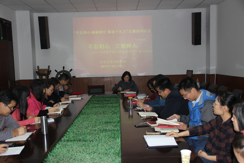 在全国上下喜迎党的十九大胜利召开之际,我院开展了“不忘初心 立德树人 ”——《习近平的七年知青岁月》学习交流座谈。教工党员的学习交流于10月17日下午进行,学生各支部的学习交流分别于18日、19日、20日进行。学院党委书记王霞、副书记张壬、各支部书记、学院全体党员及部分入党积极分子参加了学习交流。