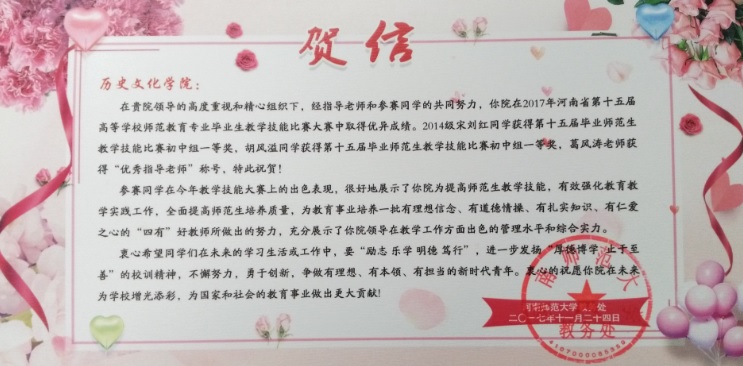 2017年11月10—12日,由河南省教育厅主办、洛阳师范学院承办的河南省第十五届高等学校师范教育专业毕业生教学技能大赛在洛阳师范学院新校区举行,我院2014级历史学专业本科生宋刘红、胡风溢两位同学表现突出,在所参加的初中组历史学科比赛中双双获得一等奖。牛琳老师和葛风涛老师获得“优秀指导教师”称号,学校教务处专门发来贺信,祝贺我院在比赛中获得佳绩。
