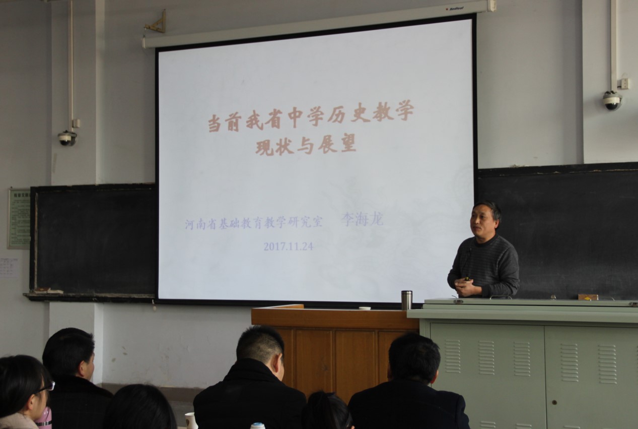 2017年11月24日下午,河南省教育厅基础教育教研室副主任李海龙先生应我院邀请,在西区阶梯楼302教室作了题为“当前我省中学历史教学的现状与展望”的专题讲座。讲座由院长巨永明教授主持,副院长鞠明库教授、牛琳老师、郭朝辉、葛风涛等青年教师以及本科生、研究生共200余人参加了此次讲座。