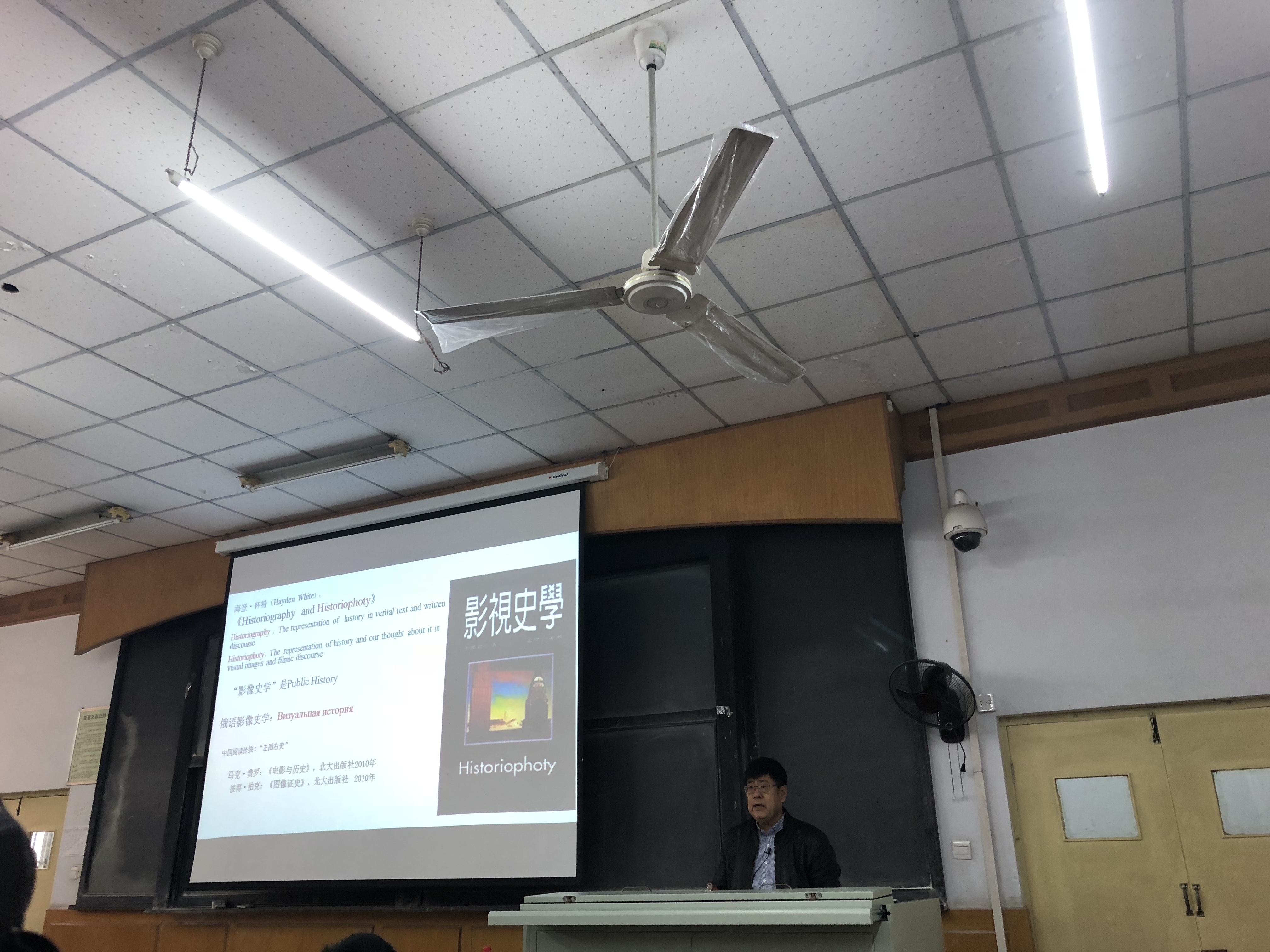在讲座中,张建华教授从现实入手,首先谈及在十月革命100周年即将来临的去年,俄罗斯总统普京在12月1号国情咨文里对十月革命的评价,随后张教授借用美国学者博尔丁的观点向我们介绍了“国家形象”的概念,即是“对行为体——国家的总体的认知、情感和评估结构”,使我们对这个课题有了一个初步的认识。为了使在场师生更加生动直观的理解俄罗斯国家形象的变迁,张教授在讲座中全程采用了影像史学的方法,穿插了许多珍贵的照片、电影、海报等珍贵史料,再加上张教授幽默风趣的语言,不但引起了在座师生的浓厚兴趣,而且深化了我们对已经远去的苏联时代的了解。最后,张教授引用周有光先生的一句话来勉励史学工作者一定“要从世界看国家,不要从国家看世界”。