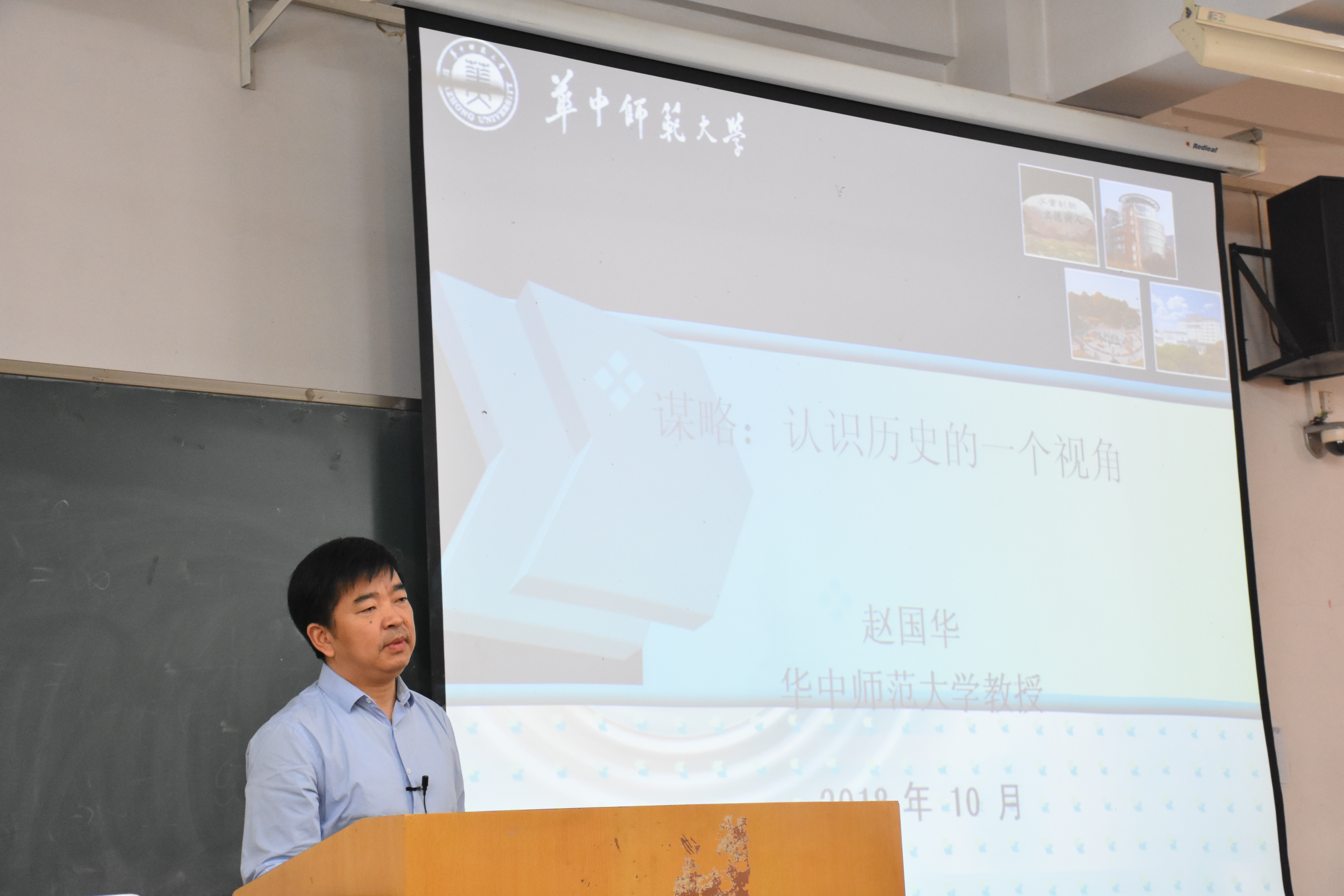 2018年10月12日16:30-18:30,应学院邀请,华中师范大学博士生导师赵国华教授莅临东教1-203教室,作题为“谋略:认识历史的一个视角”的专题讲座。讲座由历史文化学院院长苏全有教授主持,相关专业师生200余人聆听了此次讲座。