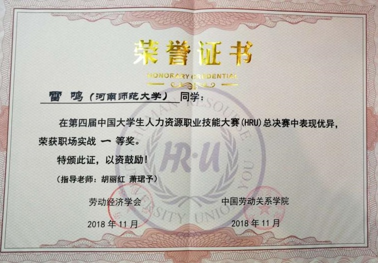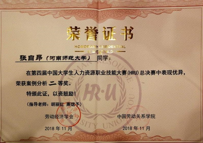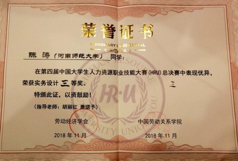 2018年11月23—25日,第四届中国大学生人力资源职业技能大赛暨海峡两岸港澳地区大学生人力资源职业技能大赛在北京中国劳动关系学院举办。此次比赛由中国劳动关系协会、中国劳动关系学院联合主办,北京华智殊才咨询有限公司协办,以“共融、共享、共创,搭建应用型人才的开发平台”为主题,吸引了全国一百多所高校前来参赛。我校代表队在历史文化学院人力资源管理专业青年教师胡丽红、萧珺予指导下喜获佳绩:雷鸣同学获得“职场实战”一等奖、张自昂同学获“案例分析”二等奖、陈涛同学获“实务设计”三等奖、田梦圆同学获“无领导小组讨论”三等奖,伟德官网下载苹果版代表队获团体二等奖。