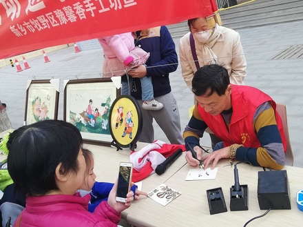 当日上午八时,春秋学社部分成员到达社区,以志愿者身份协助社区进行会场布置等任务。在布置过程中,社员同社区人员进行友好交流,也进一步了解到本次展览中的烙画、布贴画及彩绘葫芦作品,并与作品作者进行交流。上午九时,作品展示正式开始。烙画古称“火针刺绣”,近名“火笔画”、“烫画”,是用一种特制的铁笔在葫芦或其他物体上烫出烙痕作画,可以烫出丰富的层次与色调。烙画作品始一展览,便吸引了大量社区居民。而后,更有民间非物质文化艺术表演,舞狮、二鬼摔跤、空竹表演、汉服舞蹈等,将中华文化的魅力极尽展示在大家面前,渲染文化氛围。其中的舞狮与二鬼摔跤均需要武术基础,精彩表演引得观众连连叫好。空竹表演由民间老艺术家展示,超高的技艺及花式展示使观众称赞。最后,更有现场烙画表演,将现场简易烙画作品送给现场关注。现场烙画表演也将烙画技艺要求展现在观众面前。活动全程由春秋学社志愿者进行秩序维护,活动结束后将作品收好,场地回复原样。