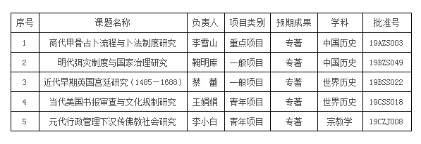 2019年7月12日,全国哲学社会科学规划办公室公布了2019年国家社科基金年度项目和青年项目立项结果,我校共有19项课题获得国家社科基金立项,其中我院获得5项,包括重点项目1项,一般项目2项,青年项目2项,经费资助115万元。 2019年历史文化学院国家社科基金年度项目立项名单