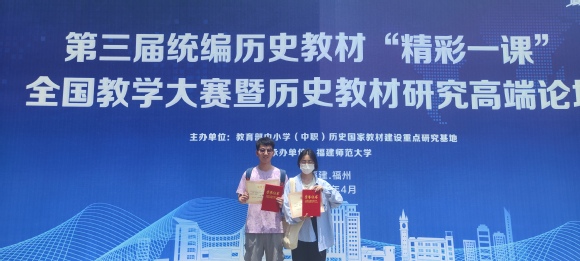 2023年4月16-17日,教育部中小学历史教材国家重点研究基地主办的第三届全国“精彩一课”教学技能大赛在福建师范大学落幕。2020级本科生冯硕、刘鹏坡经过层层选拔,代表我校参加了此次比赛。经过两天的激烈角逐,冯硕同学荣获一等奖,刘鹏坡同学荣获二等奖。马小能博士和高美苏博士作为指导教师带队参加了比赛,并双双被评为优秀指导教师。