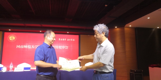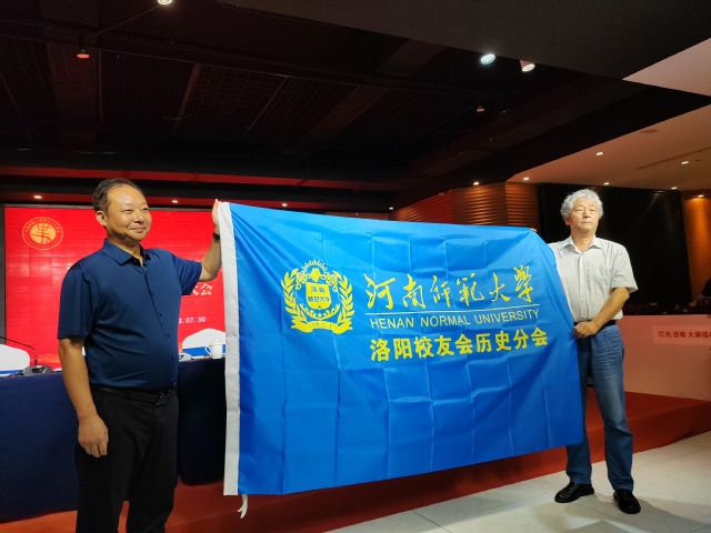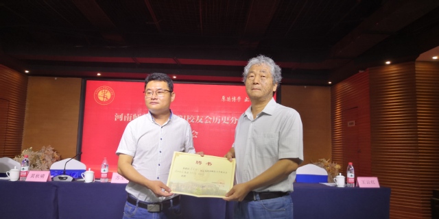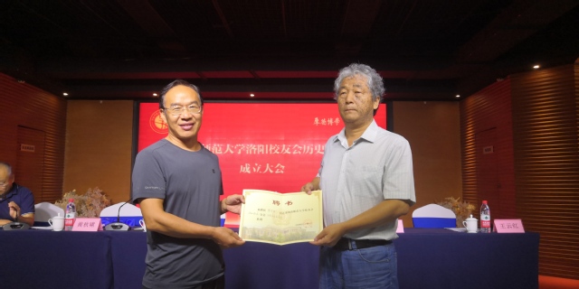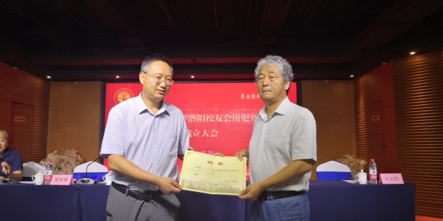 苏全有教授为洛阳校友会历史分会授旗,并依次为新当选的分会顾问、会长、副会长、常务理事、秘书长颁发聘任证书。