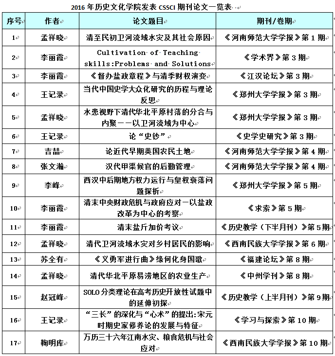 2016年历史文化学院发表CSSCI期刊论文一览表