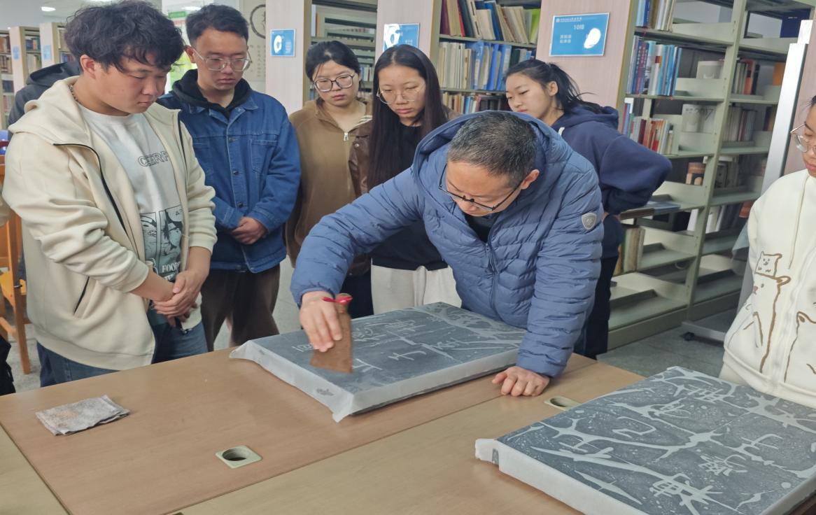 为进一步贯彻落实习近平总书记关于传承和弘扬中华优秀传统文化的指示,促进学生学以致用,将专业理论同实践相结合,3月25日上午,历史文化学院于图书馆四楼新乡地方文献中心开展了“金石传拓”实践学习活动。活动由学院副教授王仁磊主持,全体本科生积极参与。