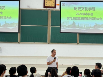 为表彰先进,树立模范典型,引导学生了解就业政策,增强就业核心竞争力,历史文化学院于6月20日下午,在文昌楼302召开2021级本科生实习总结暨发展规划指导大会。会议由2021级辅导员庞振康主持,学院副院长王守谦、世界史系主任王若茜、各专业班主任主讲,学院2021级全体本科生参会。