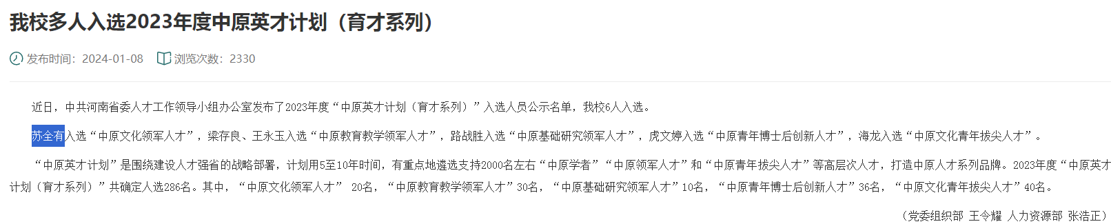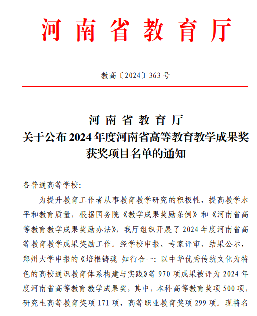 教学质量工程建设是衡量本科专业办学水平的重要指标。2024年度,学院继续加强国家级一流本科专业和省级一流本科专业建设,并着力对弱势专业锻强提质,提升优质课程、师资和教材供给水平,取得了良好效果。本年度,学院共获得省级本科高等教育教学成果奖一等奖1项、二等奖1项以及校级教学成果奖特等奖1项和一等奖1项,实现了省级以上教学成果奖年度获奖总数的突破,为申报国家级教学成果奖打下了坚实基础。在师资队伍建设方面,学院也取得了较大成绩。其中1位教师获批为“中原英才计划(育才系列)”中原文化领军人才;1人获批为河南省高校哲学社会科学创新人才,1人获批为河南省高层次人才(C类),1人获批为河南省教育厅学术技术带头人,1人荣获河南省本科高校青年骨干教师培养计划项目;获评国家级和省级教学技能竞赛优秀指导教师称号4人次,获评全国第七届大学生艺术展演优秀指导教师和第六届中华经典诵写讲大赛优秀指导教师2人次。
