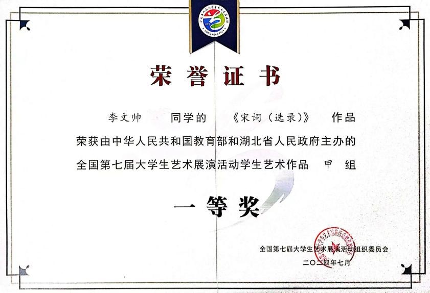 三笔字训练是师范生培养的重要一环,学院多次拨出专项资金为学生发放训练材料,大力提升本科生三笔字技能。2024年度,2022级历史学本科生李文帅的书法作品继获得河南省第七届大学生艺术展演一等奖之后,又在全国第七届大学生艺术展演中荣获书法组一等奖。这也是我校非艺术类本科生首次获得这一国家级赛事的最高奖项。除此之外,该生还在教育部和国家语委联合主办的第六届中华经典诵写讲大赛中荣获一等奖。