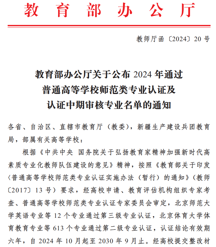 教育部师范专业认证是评估师范专业建设水平的核心举措,学院高度重视。2024年秋季,历史学专业在前期工作的基础上,顺利通过了教育部师范专业第二级认证,有效期为6年。这一认证结果,不但充分说明了师范专业的标准化运行和建设的成果,而且为申请教育部师范专业第三级认证创造了有利条件。