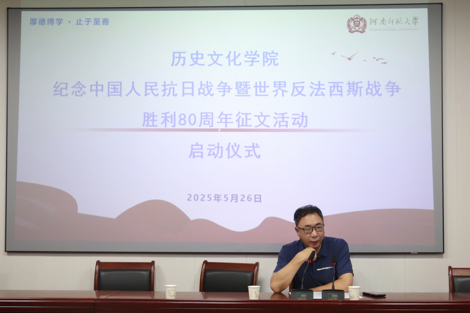 为传承抗战精神血脉,激发青年使命担当,引导学子以学术研究回应时代课题,5月25日上午,历史文化学院“弘扬抗战精神,担当光荣使命”纪念中国人民抗日战争胜利80周年暨世界反法西斯战争胜利主题征文活动启动仪式在崇德楼406室举行。历史文化学院党委书记李峰、师生代表等百余人参会,仪式由历史文化学院团委负责人庞振康主持。