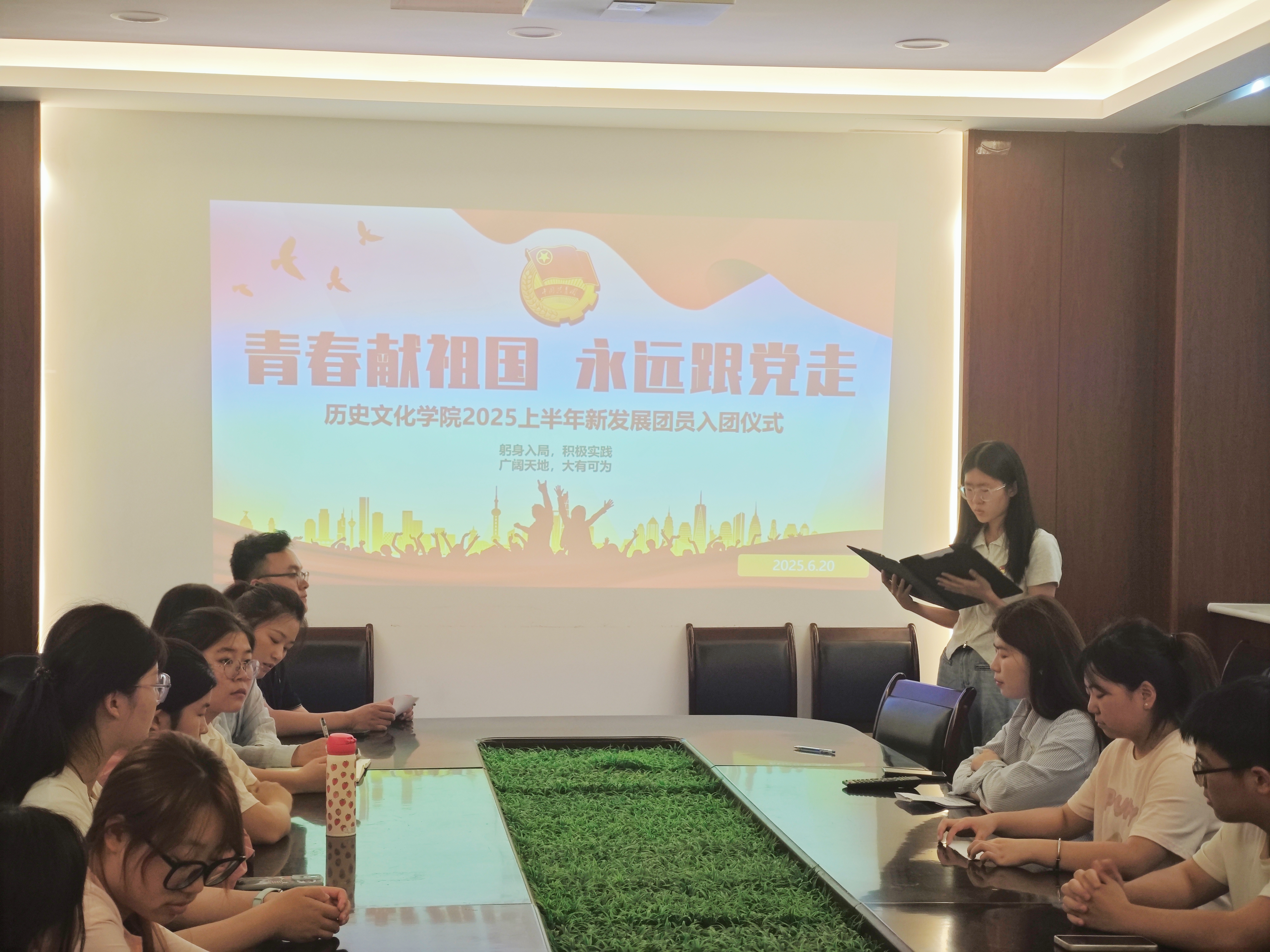 为加强青年思想政治引领,激励广大青年学子坚定理想信念,勇担时代使命,6月20日上午,历史文化学院于崇智楼205举办2025年上半年新发展团员入团仪式,历史文化学院团委负责人庞振康、2024级辅导员肖党霞、张文华和2025年上半年新发展团员参与仪式。