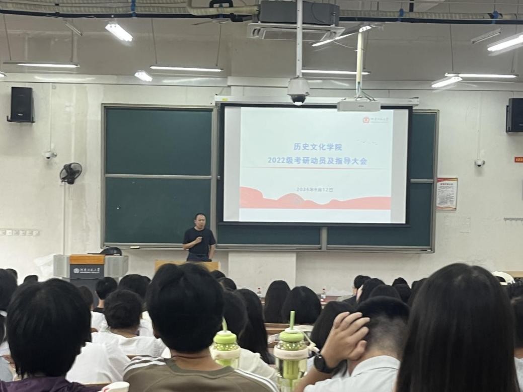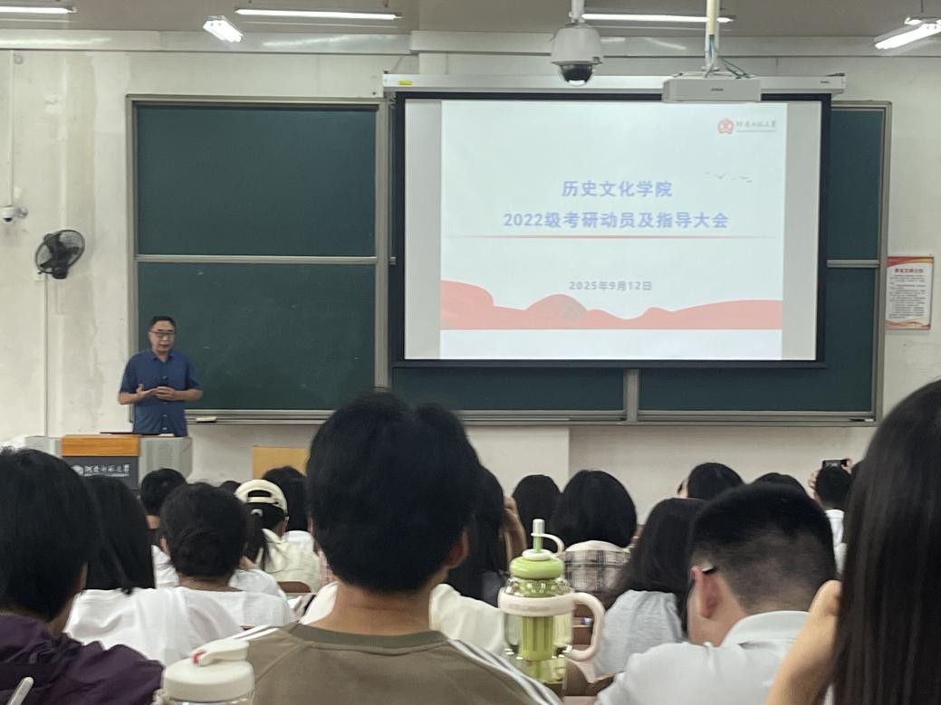 为了帮助学生明确备考方向、缓解备考焦虑,为考研学子注入信心与动力,历史文化学院于9月12日下午召开2022级考研动员及指导大会,党委书记李峰、副院长王守谦、研究生导师鲍颖建、团委副书记庞振康、2022级各班主任老师和专职辅导员肖党霞出席大会,毕业生代表和2022级全体学生参与。本次会议由袁田老师主持。